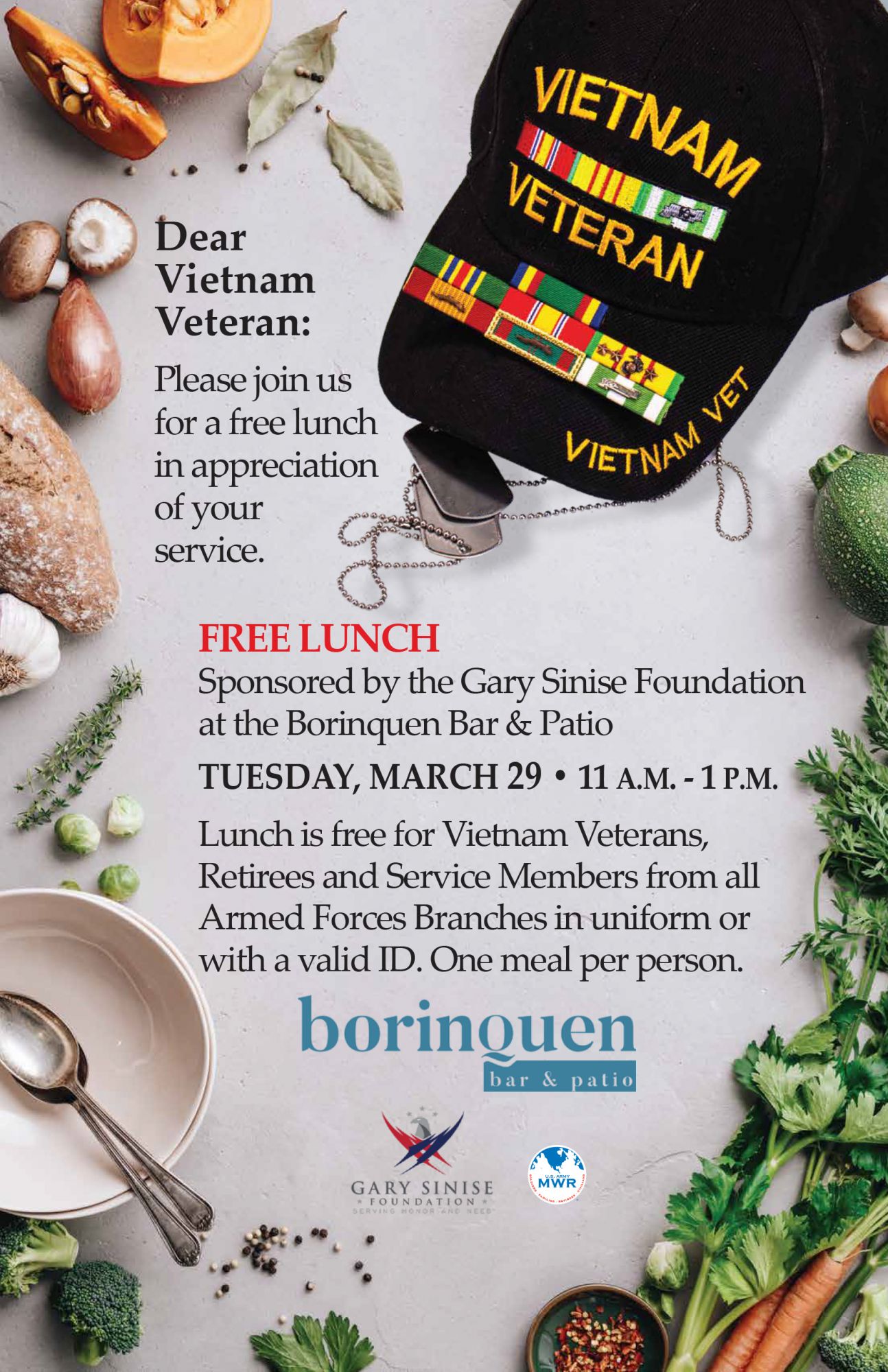 The Gary Sinise Foundation invites all Service Members to our Vietnam Veterans Free Lunch on March 29 at from 11 am to 1 pm.