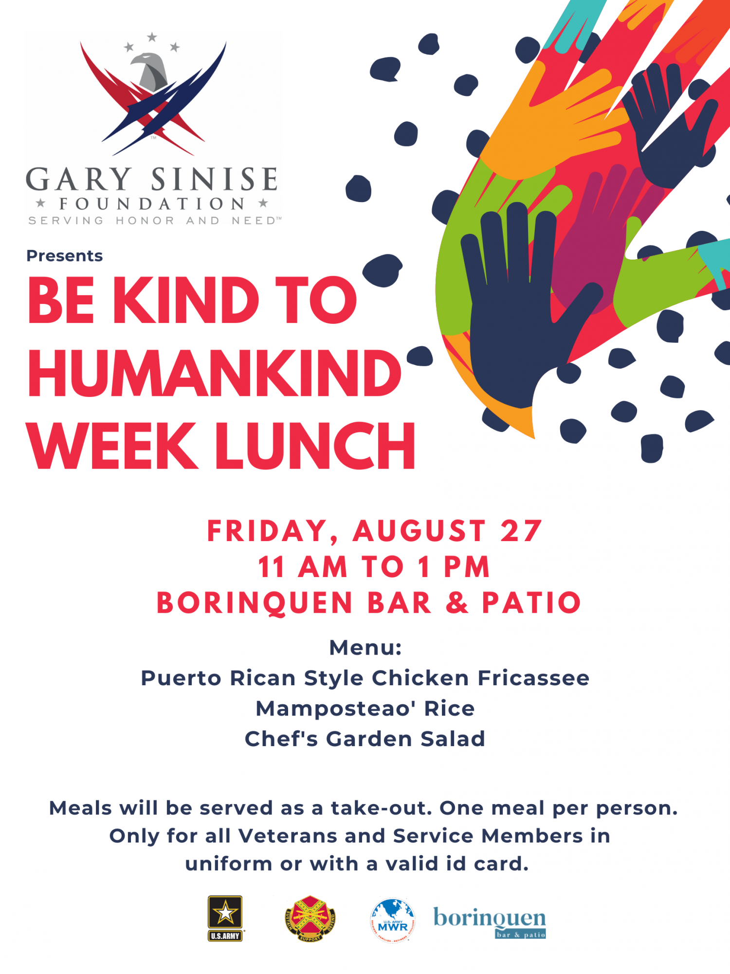 Join us on Friday, August 27 at Borinquen Bar & Patio to celebrate the "Be Kind to Humankind Week Lunch" from 11 a.m. to 1 p.m.
