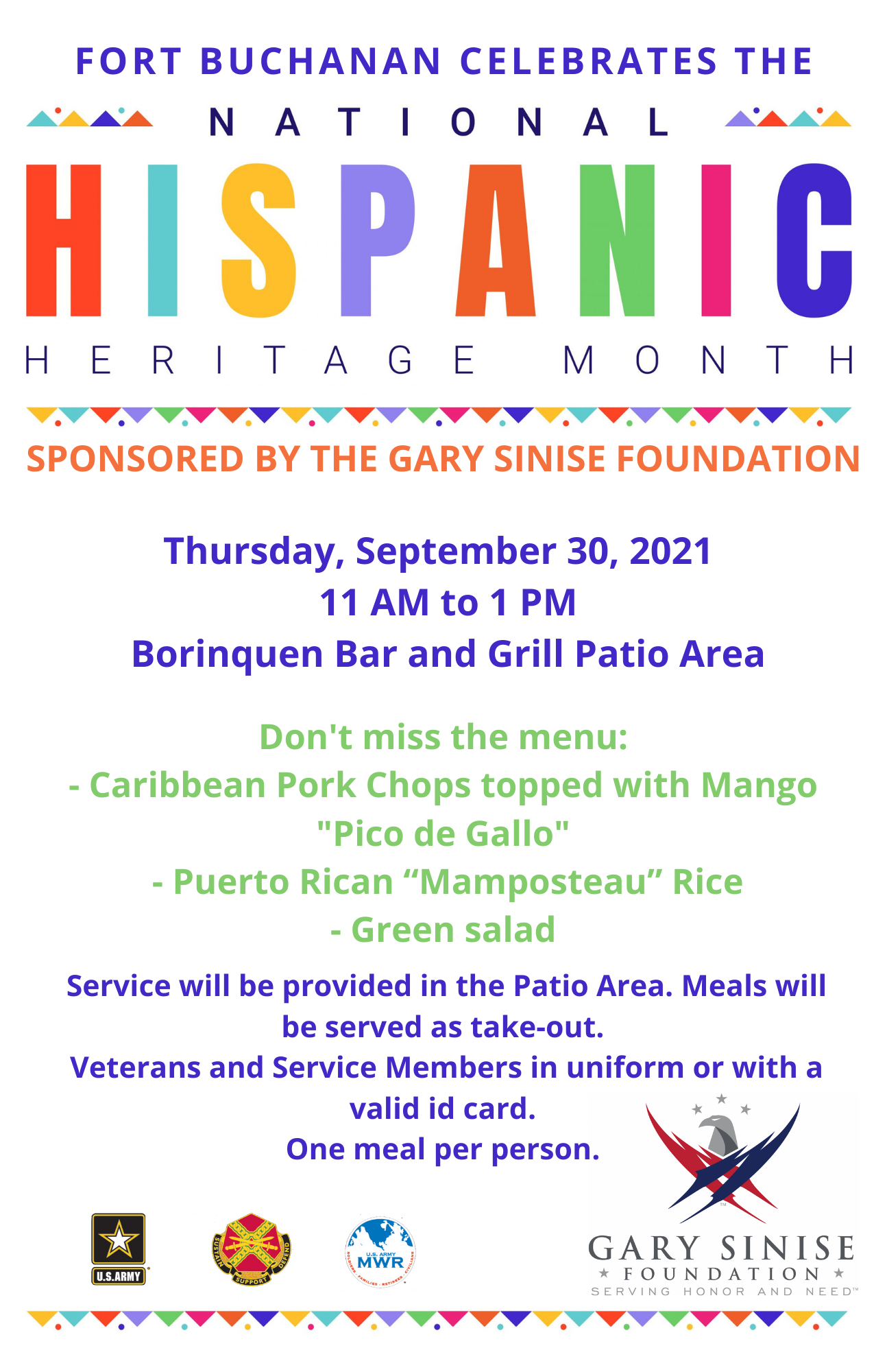 The Gary Sinise Foundation invites you to celebrate the Hispanic Heritage Month and to enjoy a special lunch menu this Thursday, September 30 from 11 a.m. to 1 p.m. at Borinquen Bar & Patio. Don't miss it!