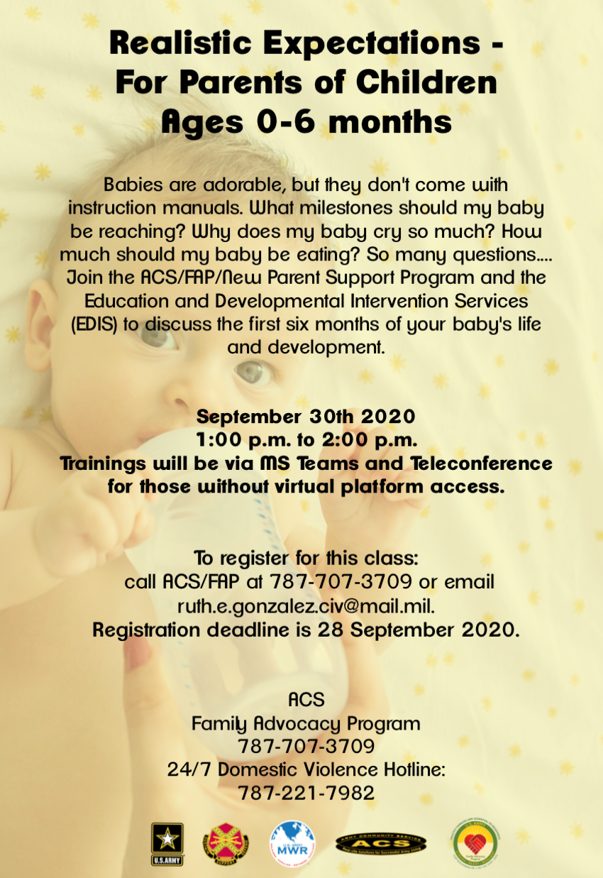 Join the ACS/FAP, the New Parent Support Program, and the Education and Developmental Intervention Services (EDIS) to discuss the first six months of your baby's life and development.