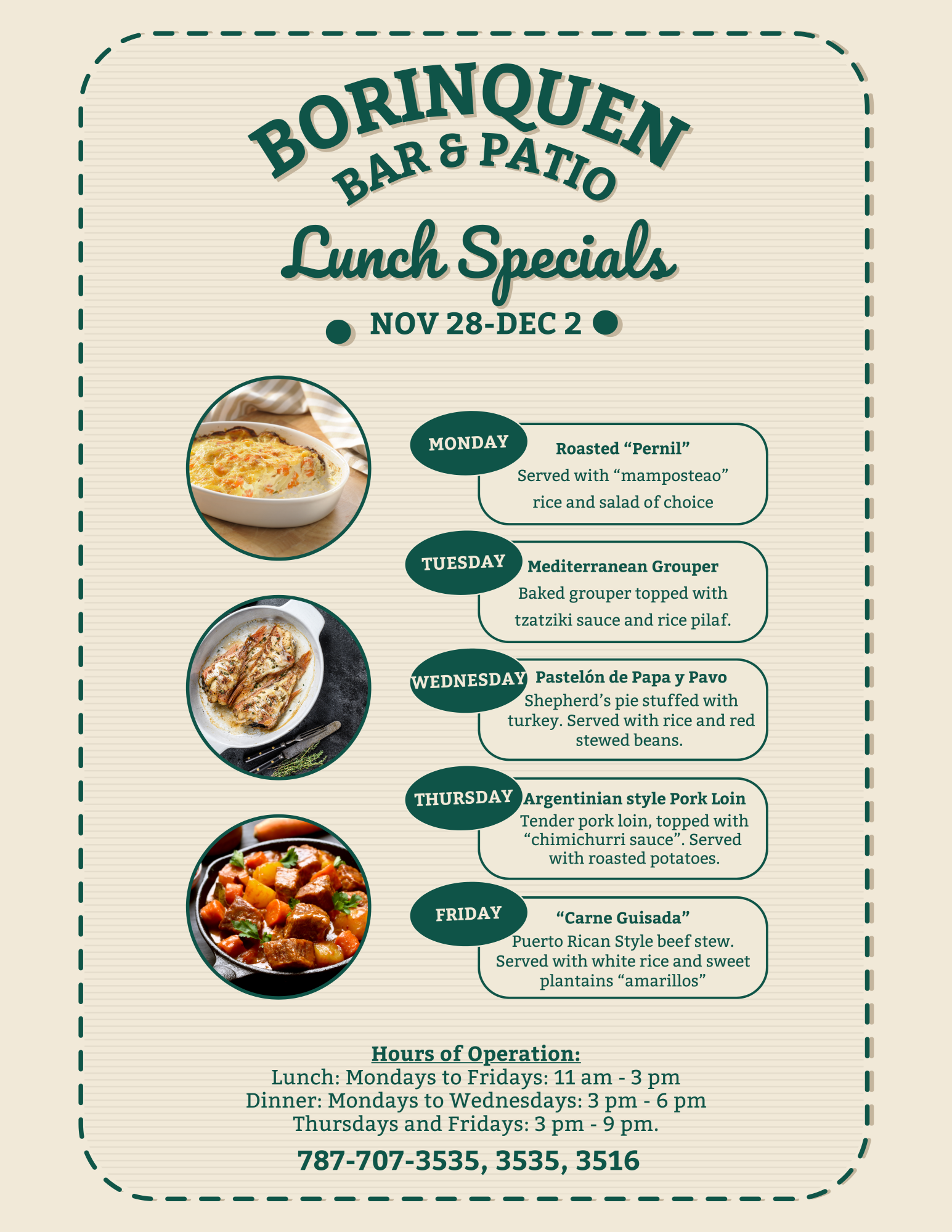 Borinquen Bar & Patio Lunch Specials November 28 - December 2