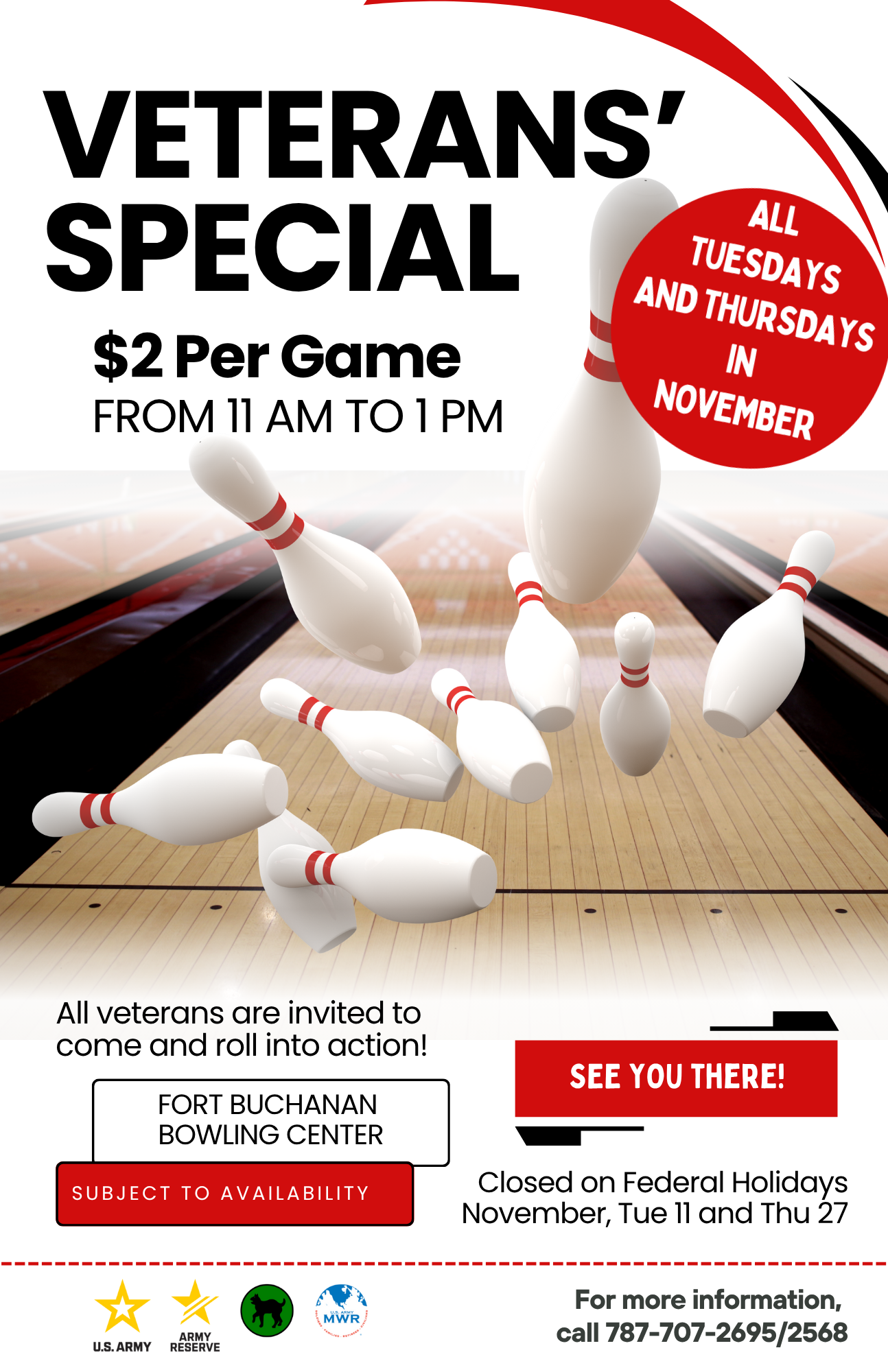 In honor of our Veterans, the Fort Buchanan Bowling Center invites all Veterans to enjoy a special offer this November — a fun and affordable way to celebrate camaraderie and community.