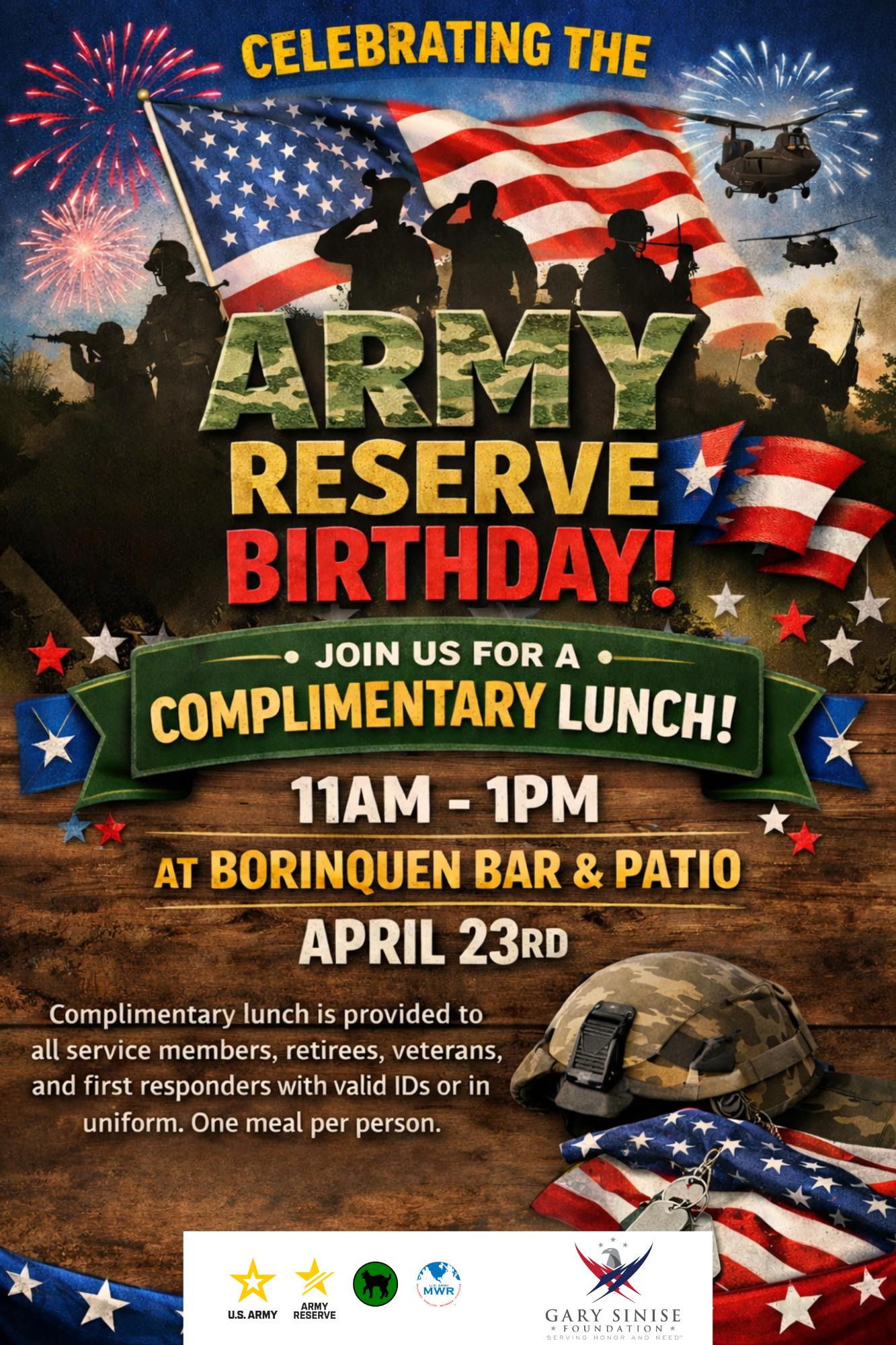 The Army Reserve turns 118 years on Thursday, April 23 and The Gary Sinise Foundation is sponsoring a lunch for all service members, retirees, veterans, and first responders with a valid ID or in uniform. Join us from 11 am to 1 pm at Borinquen Bar & Patio.