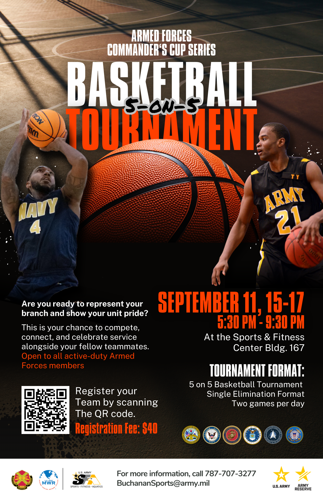 Register Now!Are you ready to represent your branch and show your unit pride? Step onto the court and compete for glory at Fort Buchanan’s Armed Forces 5-on-5 Basketball Tournament — part of the Commander’s Cup Series!