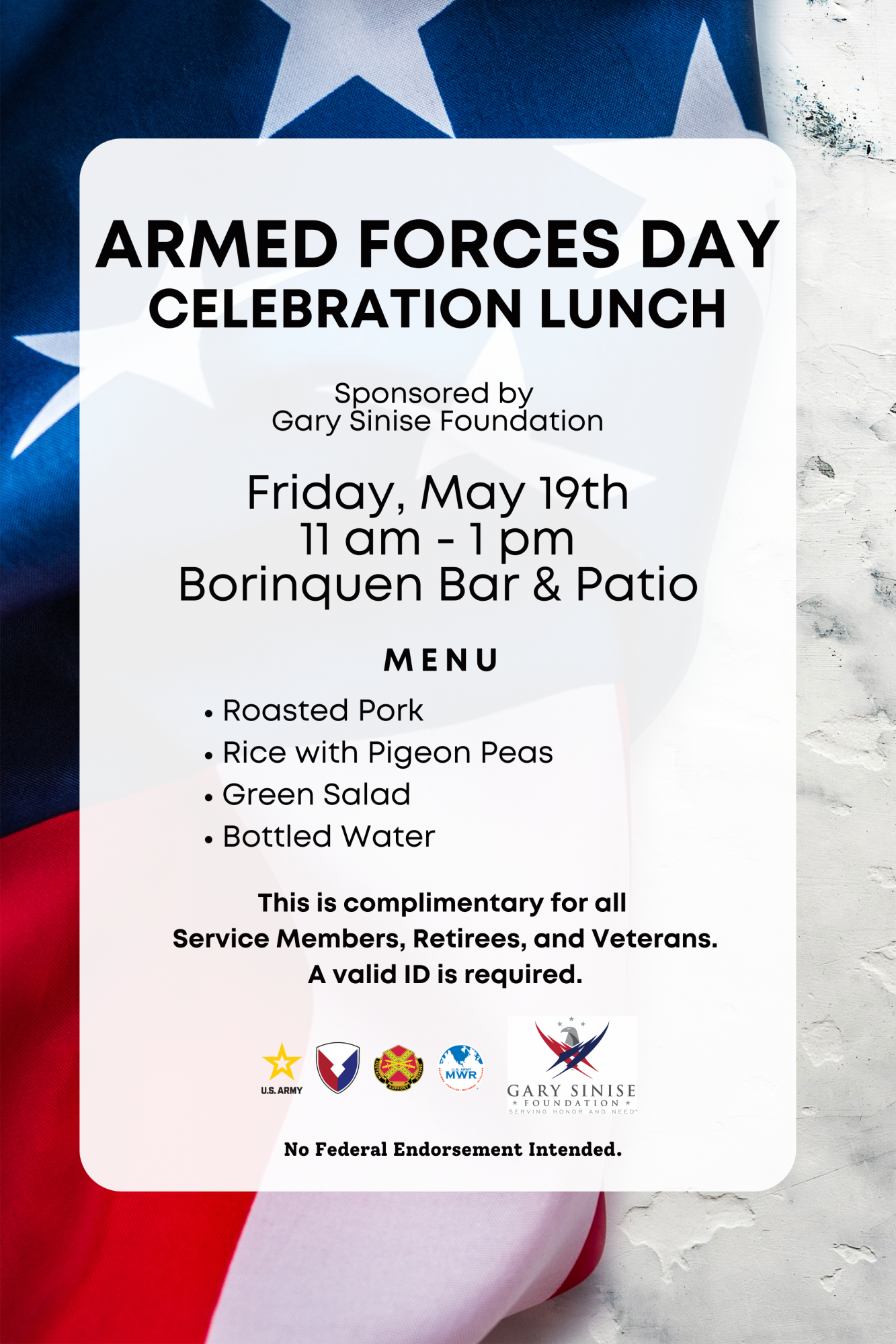 This lunch is complimentary for all Service Members, Retirees, and Veterans with a valid ID card.