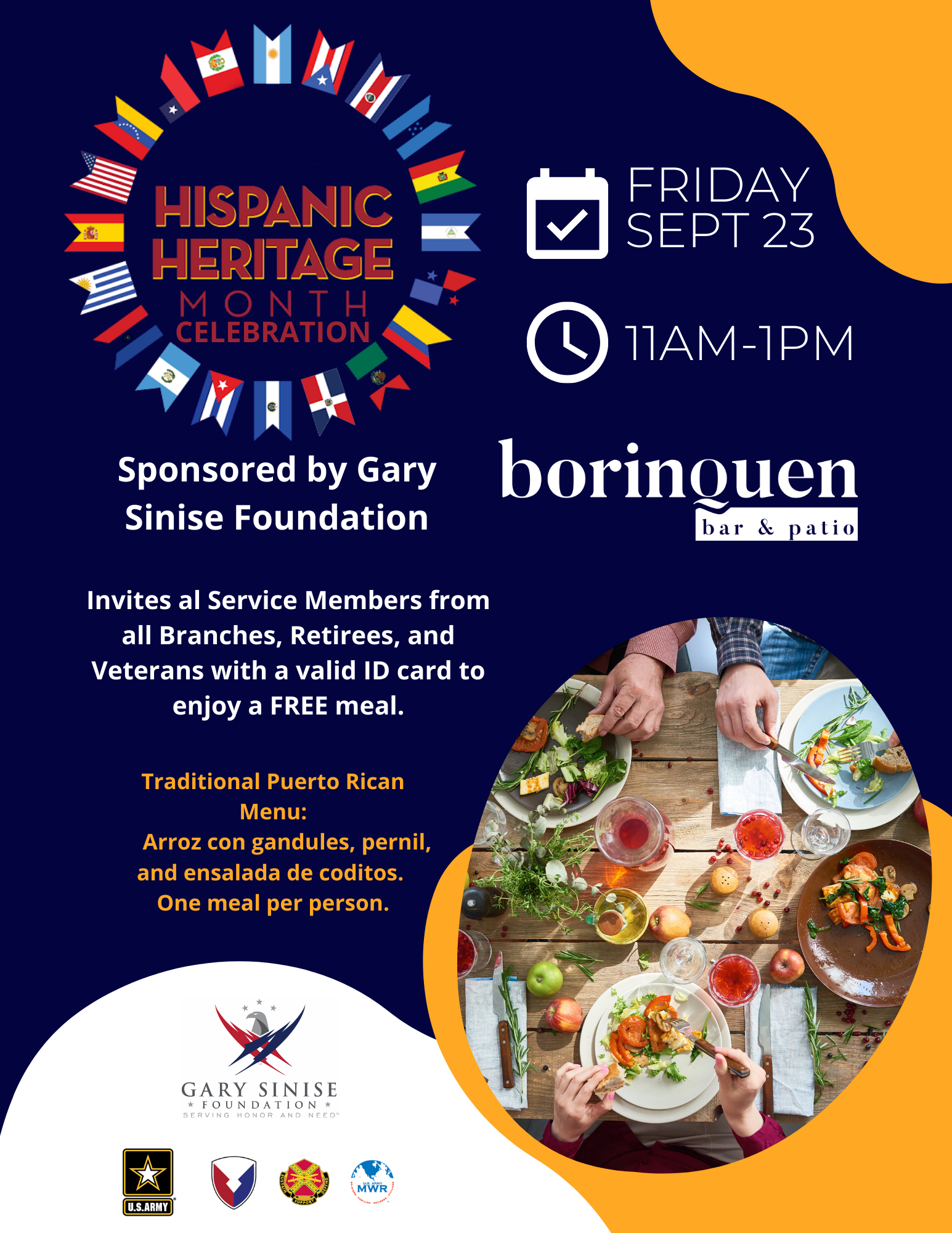 Sponsored by Gary Sinise Foundation Invites al Service Members from all Branches, Retirees, and Veterans with a valid ID card to enjoy a FREE meal.