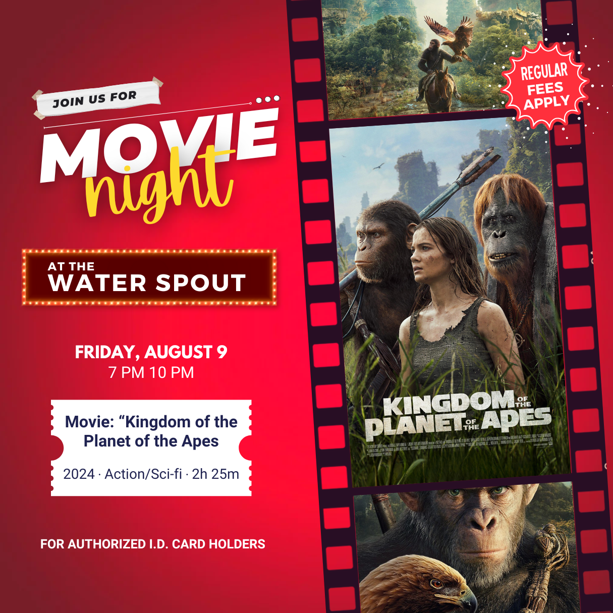 Join us at the Waterspout for an amazing movie night. Let's see "Kingdom of the Planet of the Apes".