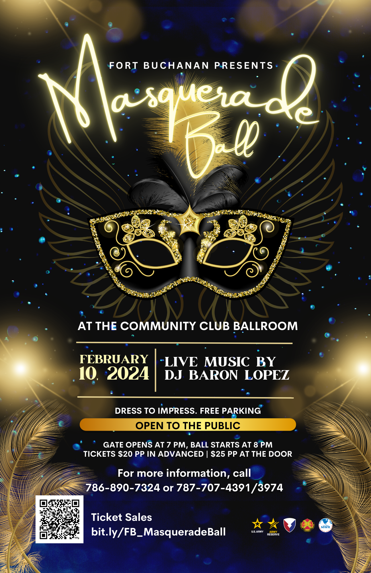 Join us for an evening of elegance, masks, and dancing on Saturday, February 10 starting at 8 pm (gate opens at 7 pm) at the Community Club Ballroom.