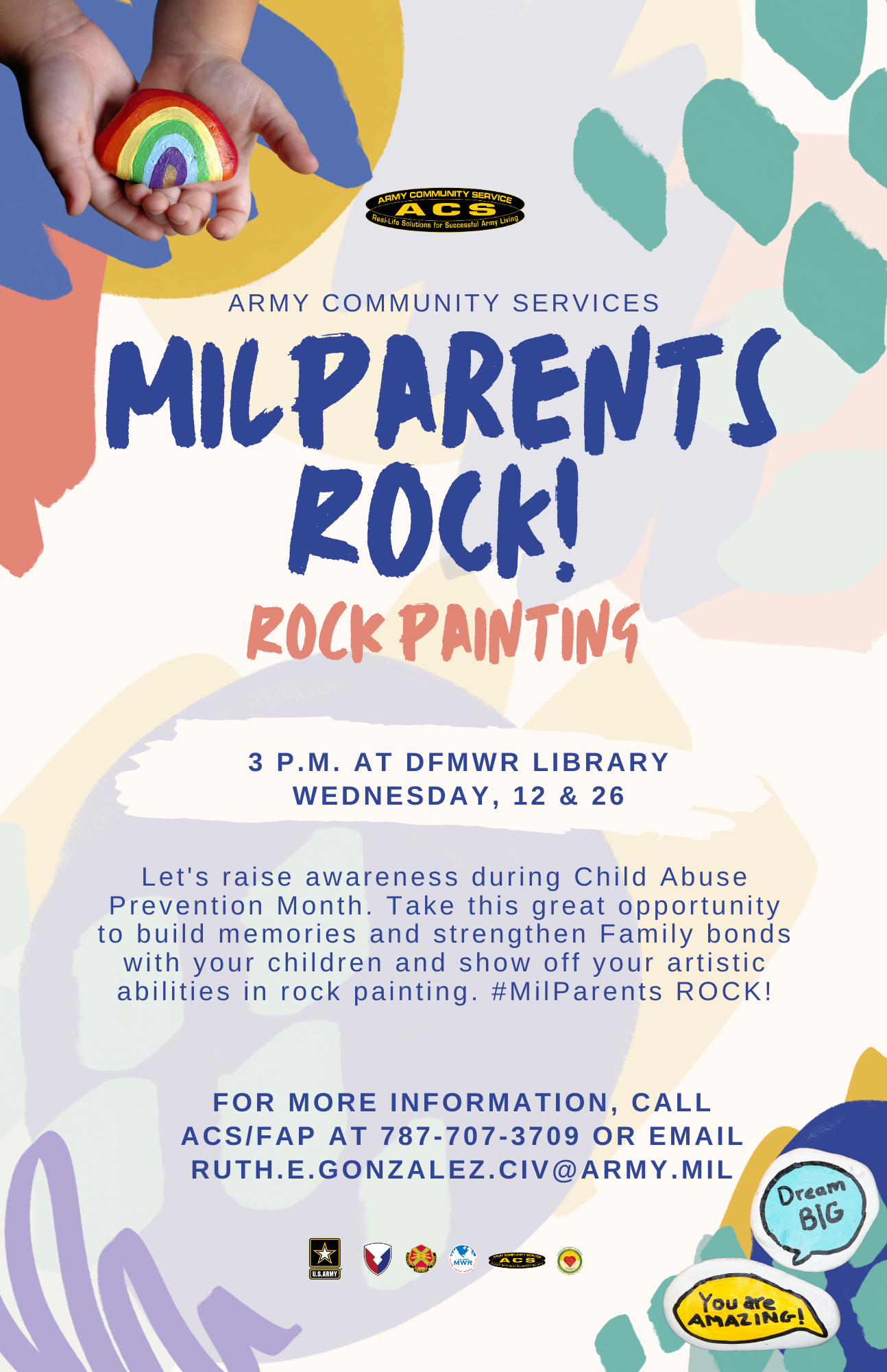 Let's raise awareness during Child Abuse Prevention Month. Take this great opportunity to build memories and strenthen Family bonds with your children and show off your artistic abilities in rock painting. Click to see the flyer.
