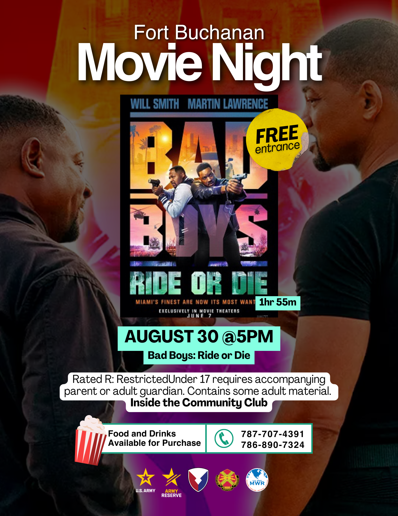 Join us for a night of super action. Enjoy the movie Bad Boys "Ride or Die". Rated R on Friday, August 30 starting at 5 p.m.