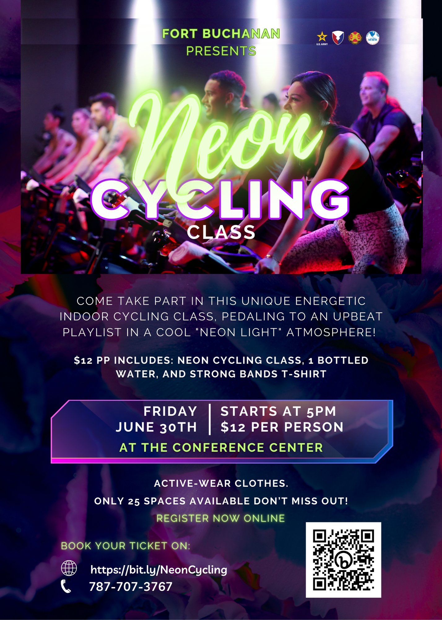 Register Now!Come take part in this unique energetic Indoor Cycling Class, pedaling to an upbeat playlist in a cool "Neon Light" atmosphere!