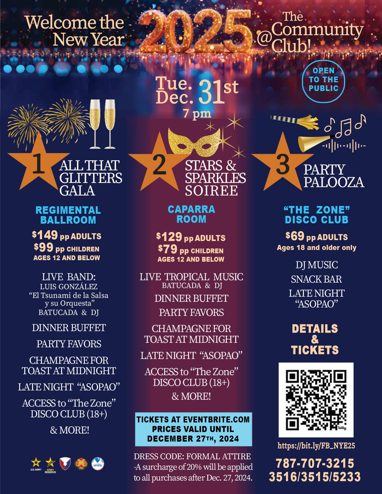 Includes: Live Tropical Music , Batucada and DJ Music, NYE Dinner Buffet / Party Favors / (1) Beverage of choice, Midnight Champagne for toast Toast / Late night "Asopao". Plus, Access to The Zone Disco Club (18yr and over).