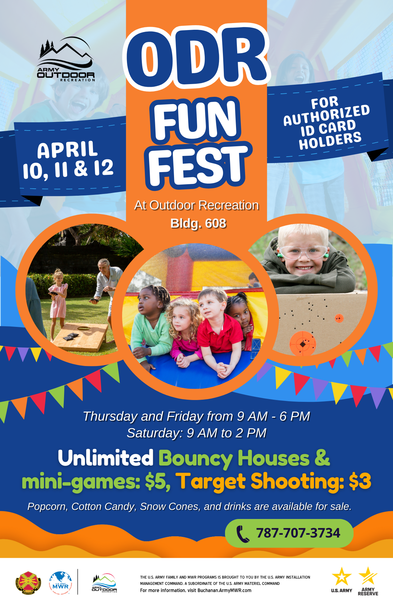 Join us at Outdoor Recreation (Bldg. 608) for the ODR Fun Fest, happening April 10, 11, & 12! This exciting event is packed with activities for all ages—it's the perfect way to enjoy the outdoors with your family and friends.