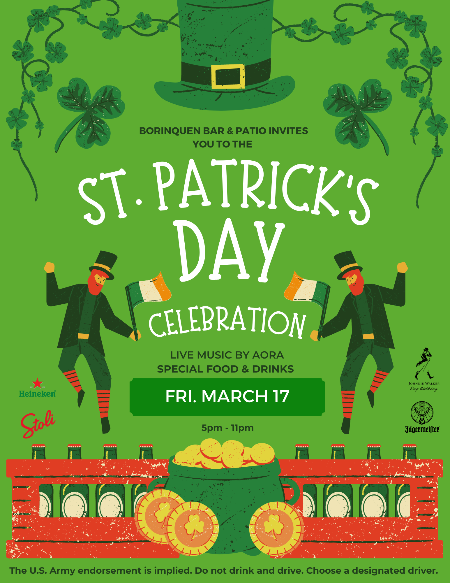 Party with us to cel;ebrate the St. Patrick's Day on Friday, March 17 from 5 p.m. at Borinquen Bar & patio.