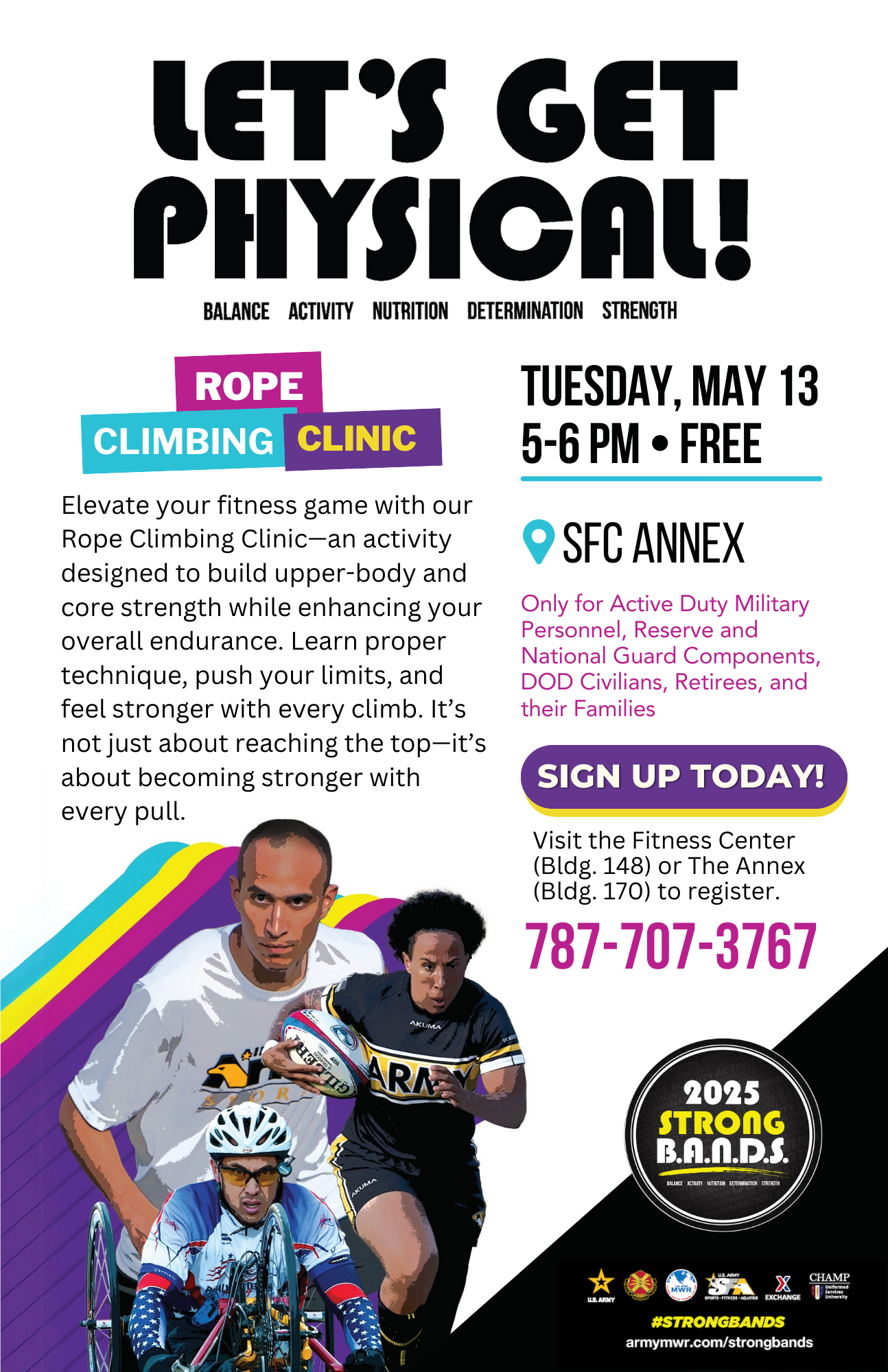 Come to the Fort Buchanan 24/7 PFC Roberto E. Clemente Walker Annex and take part in this challenging physical activity, where you will be taught the fundamentals of Rope Climbing, work your entire body and boost your mental toughness!