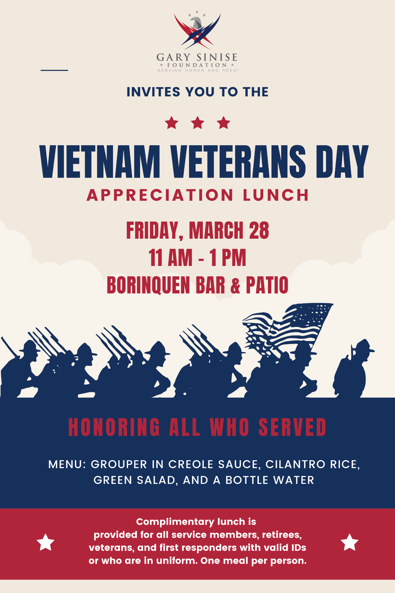 Honoring all who served! The Gary Sinise Foundation invite all service members to a complimentary lunch in commemoration of the Vietnam Veteran's Day. Click to see the menu.
