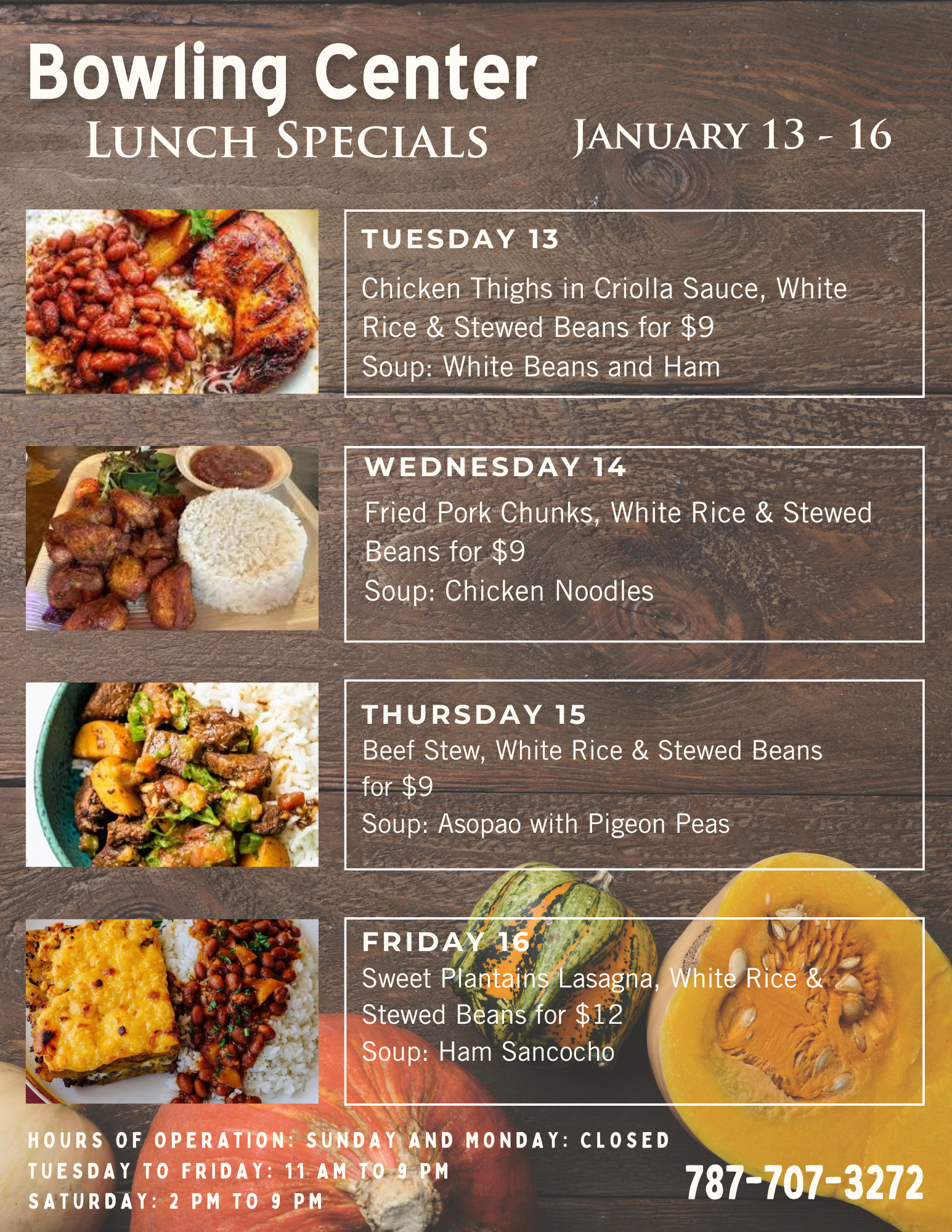 The Bowling Center offers a variety of daily lunch specials. Available from Tuesdays to Fridays starting at 11:00 a.m. Click to see this week's menu. Also available our delicious soup of the day and desserts for everyone!