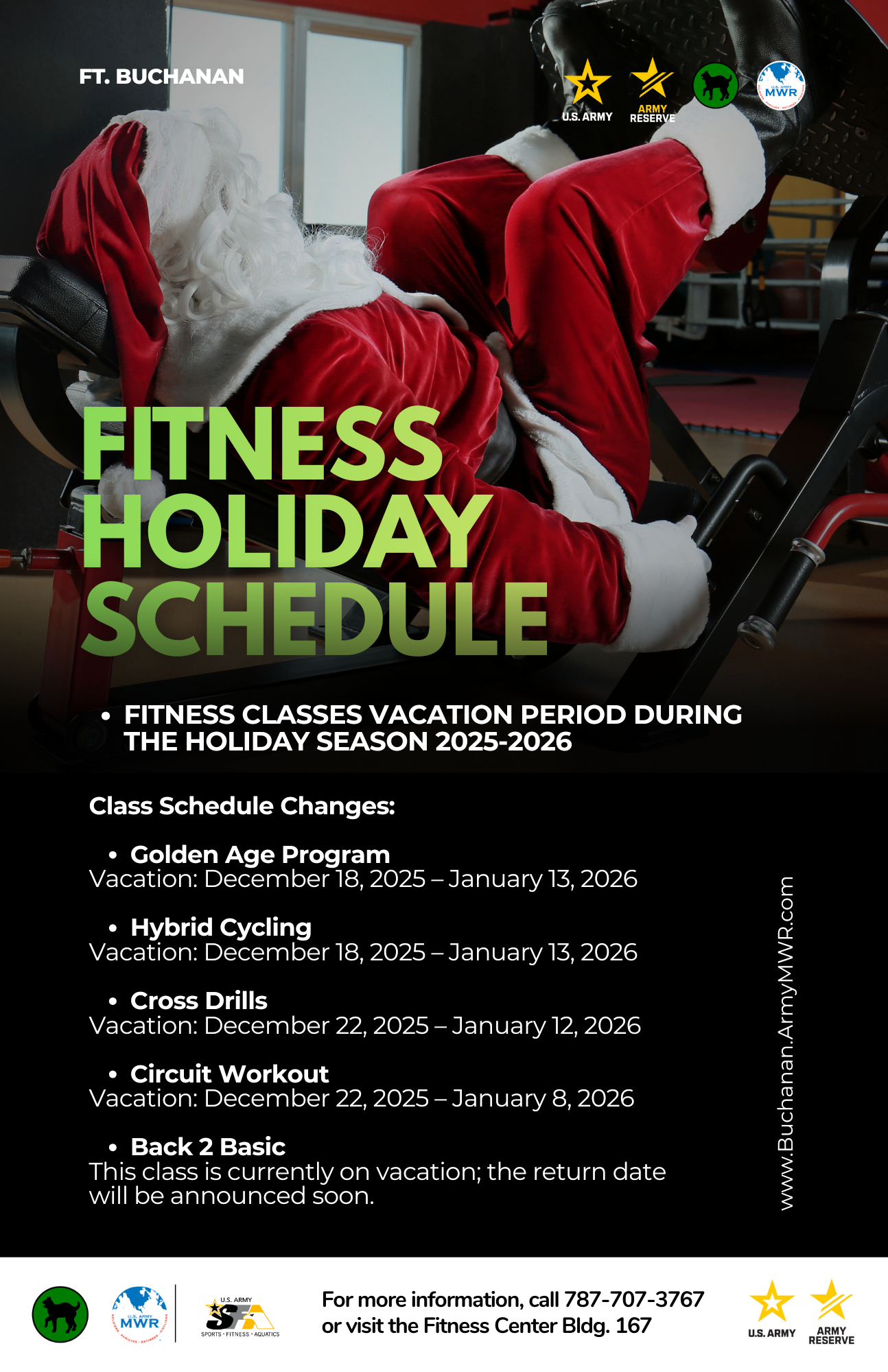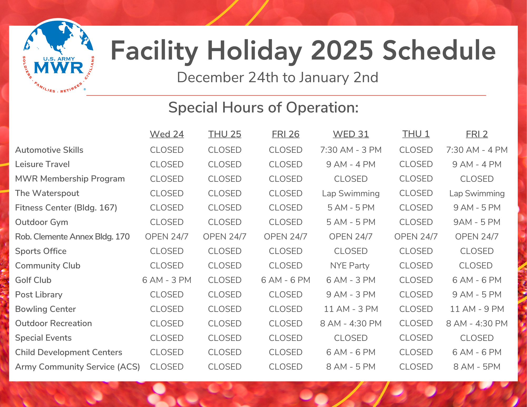 Please be advised that Fort Buchanan MWR facilities will operate under special holiday hours from December 24 through January 2. During this period, several facilities will have adjusted schedules, limited hours, or temporary closures in observance of the holiday season. Patrons are encouraged to review the detailed Holiday Hours schedule carefully and plan visits accordingly. Regular operations will resume after the holiday period unless otherwise noted. We appreciate your understanding and wish you and your family a safe and happy holiday season.
