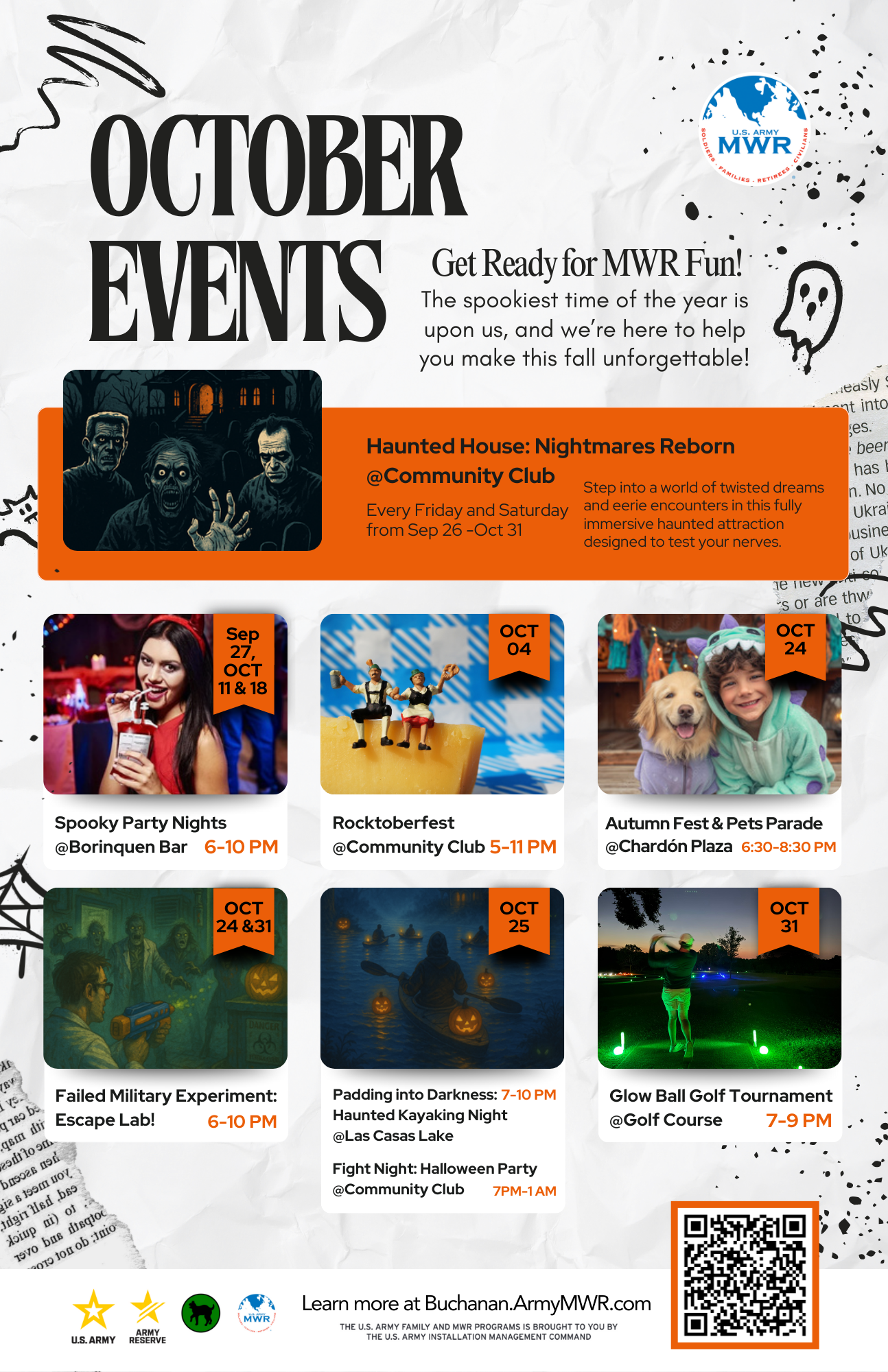 - Failed Military Experiment: Escape Lab: Step into a haunted mission on October 24 and 31 from 6:00 to 10:00 PM at Bldg. 608. Use gel blasters to battle your way through chaos and strange creatures. Ages 12+ with an adult. $10 per person. Drinks and snacks are available.